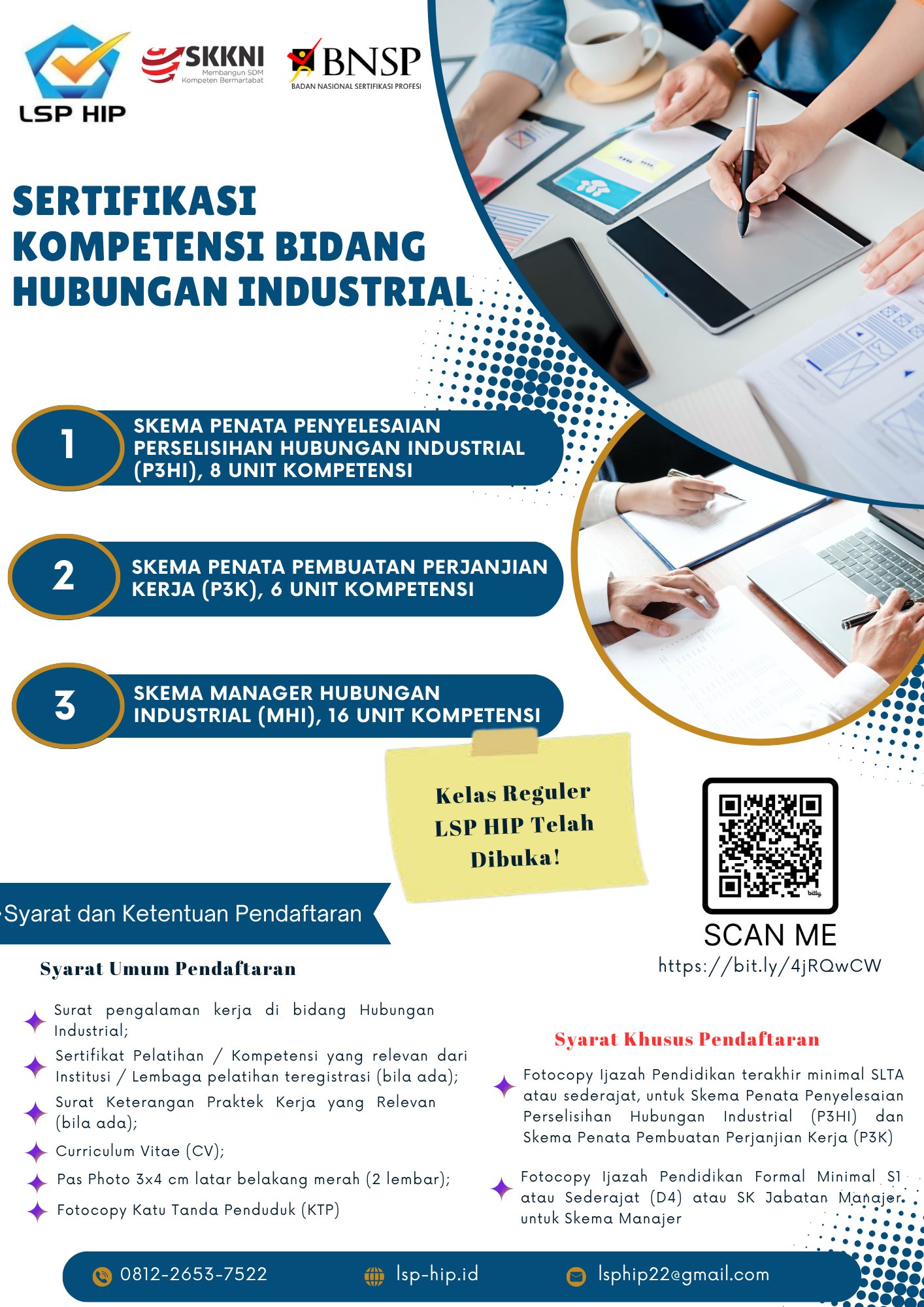 LSP Hubungan Industrial Pancasila (LSP HIP) membuka kesempatan bagi para profesional di bidang hubungan industrial untuk mengikuti sertifikasi kompetensi resmi yang diakui oleh BNSP (Badan Nasional Sertifikasi Profesi). Sertifikasi ini ditujukan untuk mengukur dan mengakui kompetensi kerja berbasis SKKNI (Standar Kompetensi Kerja Nasional Indonesia).